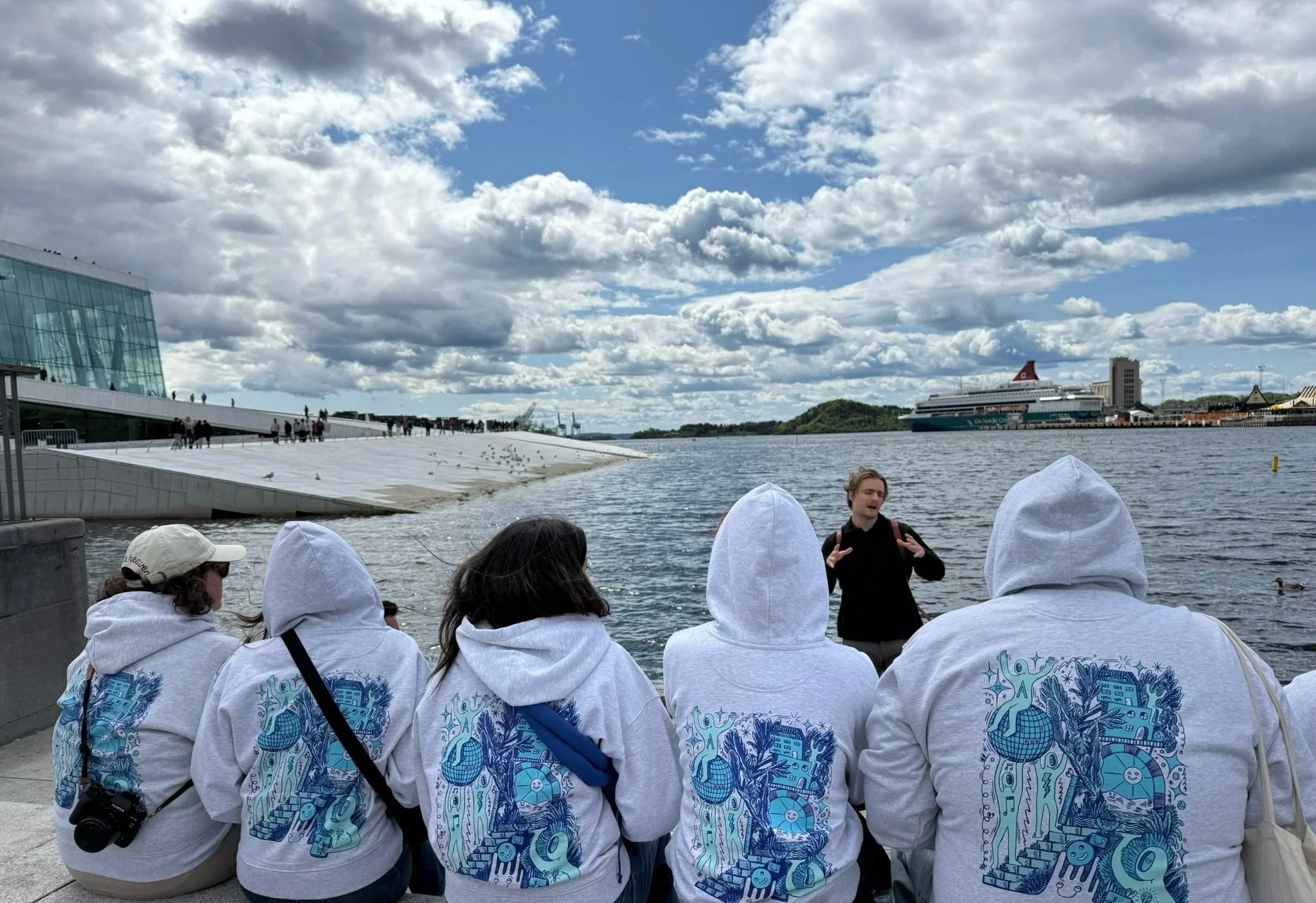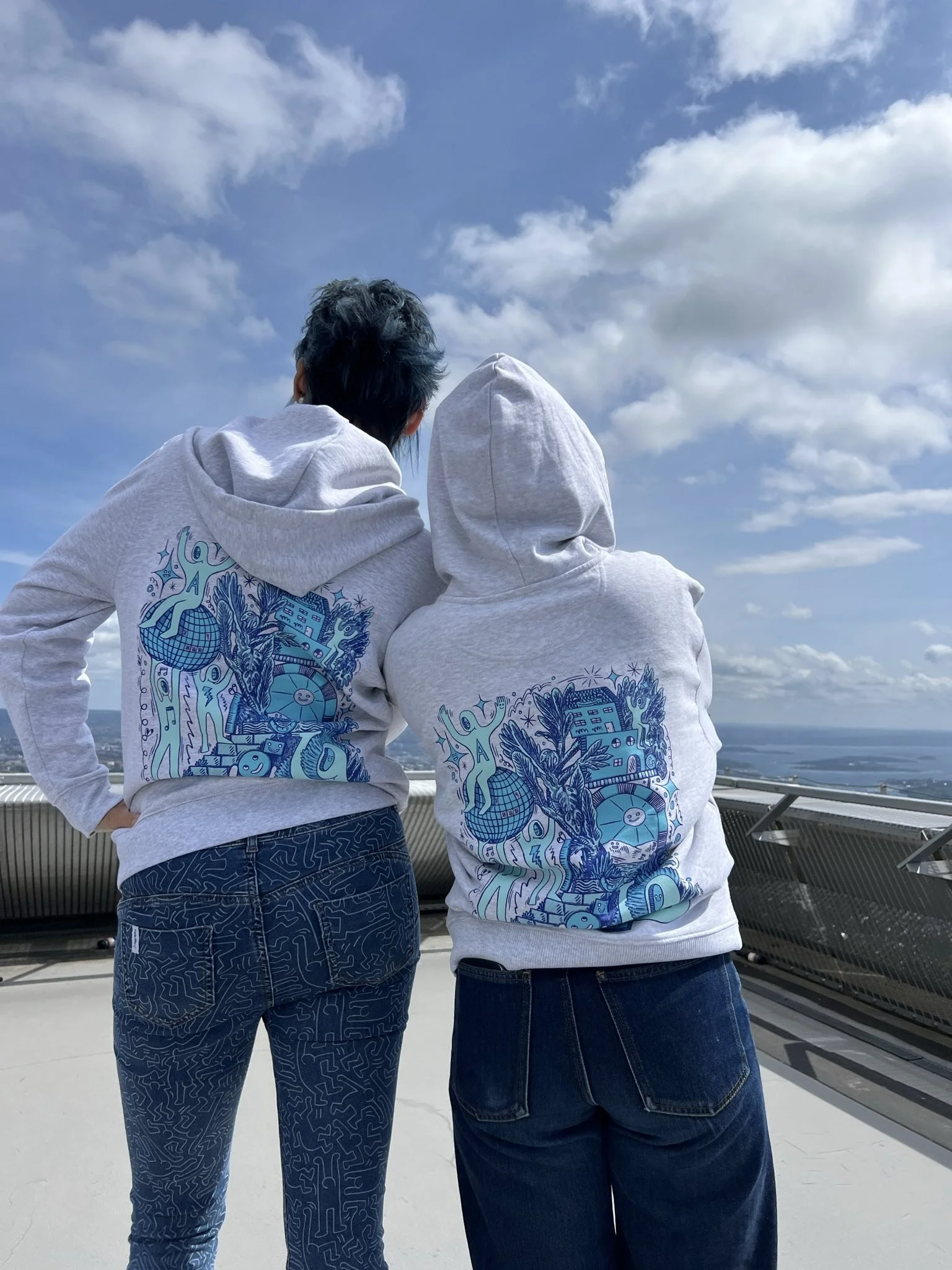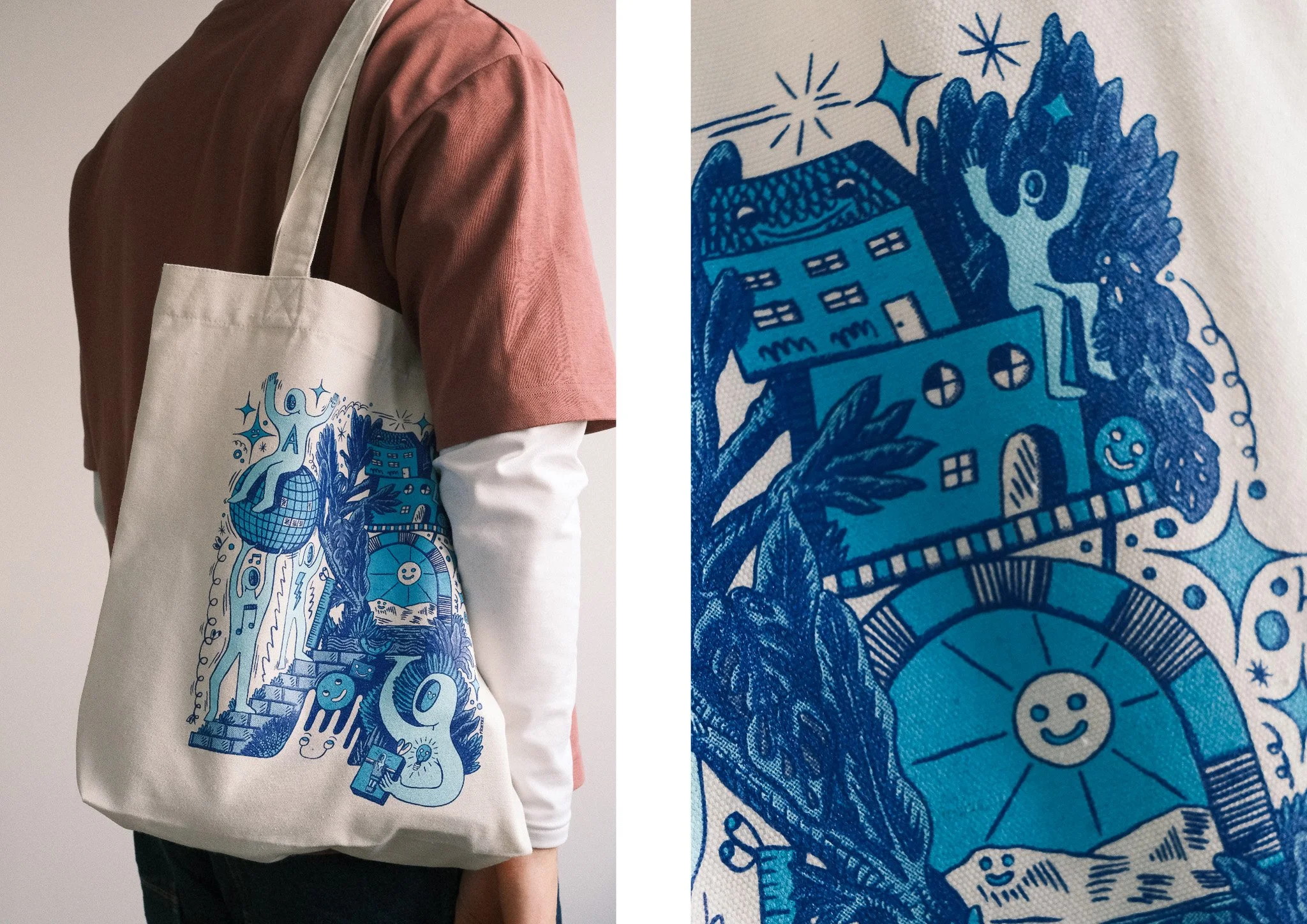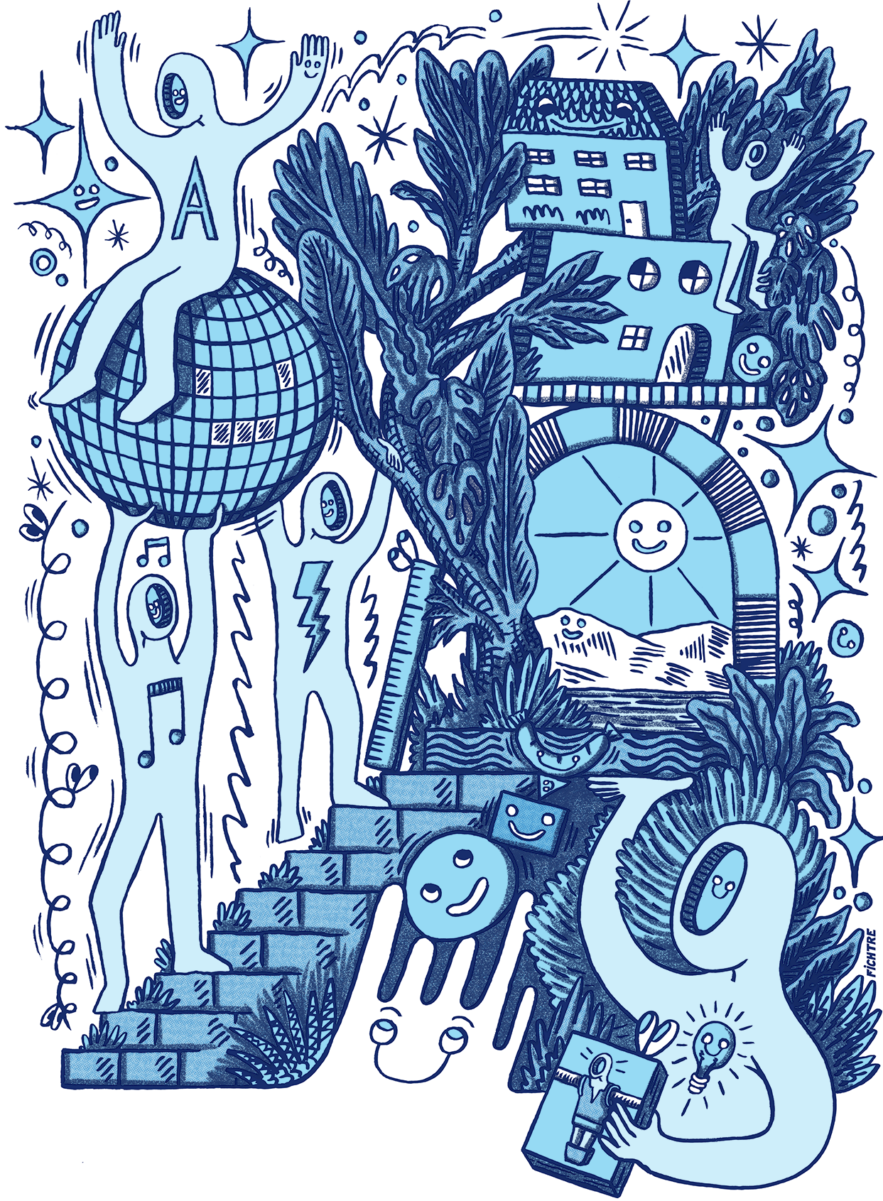 Pour célébrer nos cinq ans, nous avons donné carte blanche à Fichtre, artiste pluridisciplinaire suisse, pour créer une pièce unique représentant l’esthétique et l'émulation d’Arcadie. Son illustration explore notre univers à travers l’architecture, les festivités et les activités collectives qui nous rassemblent.
