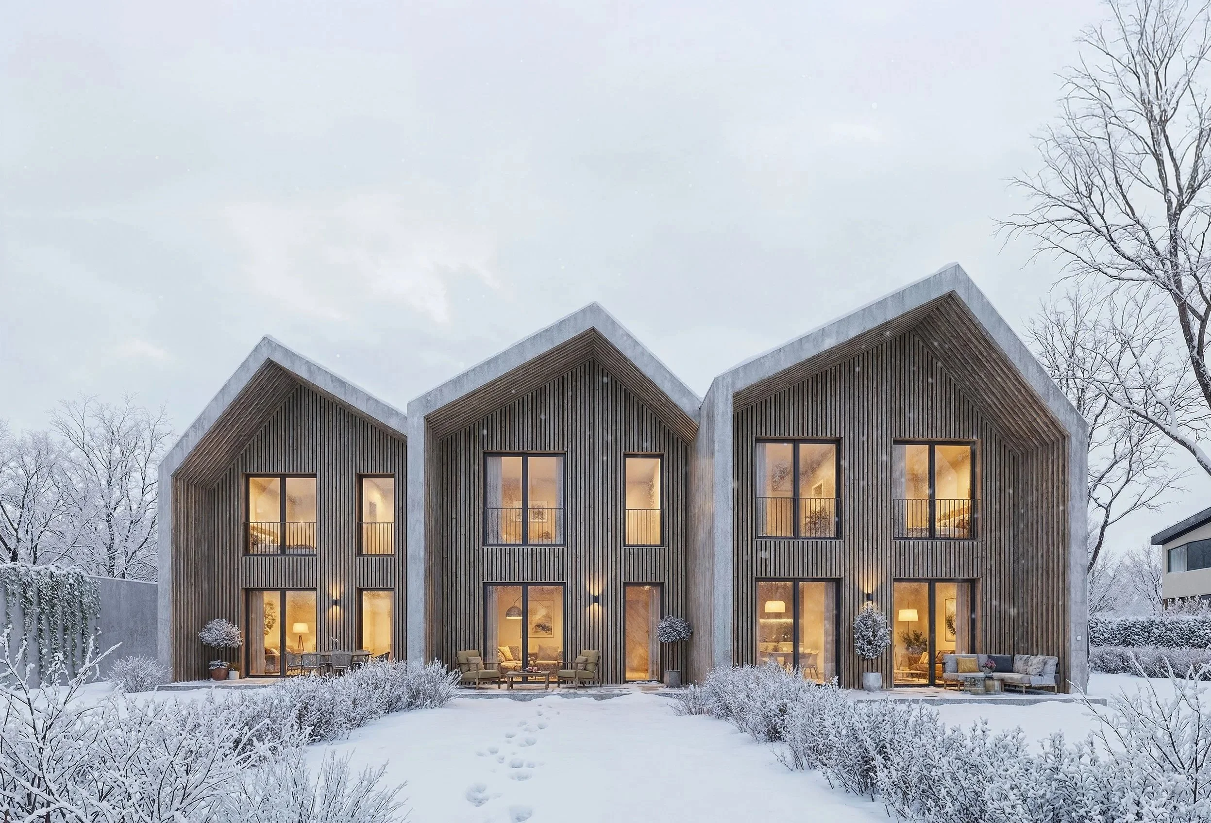 Ce projet consiste en la réalisation de trois maisons mitoyennes implantées sur un terrain offrant une vue exceptionnelle sur le lac Léman et les Alpes, depuis la ville de Nyon. Il s'inscrit dans une démarche de densification raisonnée et plurielle, rendue possible par la démolition responsable d’une maison existante.