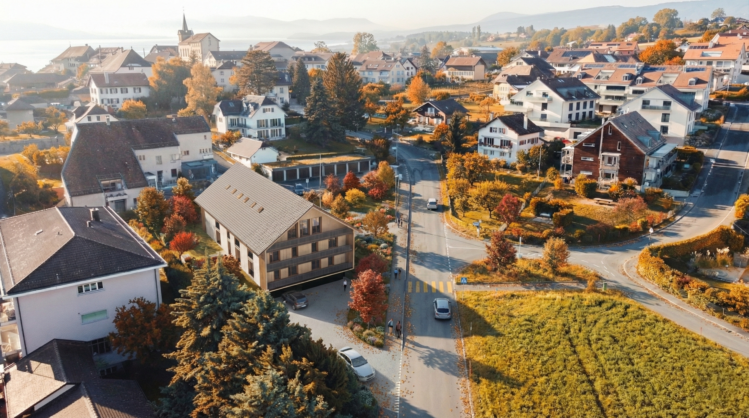Hespérie est un petit immeuble de neufs logements à loyers abordables (LLA) et adaptés, situé à l’entrée du village de Yens (VD). A proximité de toutes les commodités, le bâtiment vient dialoguer avec la morphologie de la maison de campagne afin de s’intégrer au mieux à son environnement, tout en proposant une réinterprétation moderne et discrète. Jouant avec la topographie naturelle du site, le rez inférieur permet un accès direct en voiture grâce à des places de stationnement couvertes, tandis que le rez supérieur est accessible de plain-pied depuis la Route de la Gare et directement depuis les commerces adjacents à la parcelle, au nord et à l’ouest.