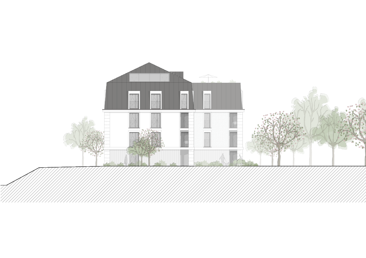 Situé à proximité d’une villa historique datant de 1909 et au cœur d’un quartier au charme traditionnel, nous avons puisé notre inspiration pour réimaginer le bâtiment résidentiel comme une maison nichée dans son jardin. Guidées par cette idée, nous avons articulé deux volumes autour d’une distribution centrale, afin de dialoguer avec l’échelle des constructions voisines, notamment la villa Buissonnière et les résidences adjacentes au sud. Réinterprétant les codes de l’architecture traditionnelle présente dans le quartier, notre projet propose une toiture à mansard. Seul le volume nord offre un étage en comble, qui se voit prolongé au sud par une toiture terrasse végétalisée s’ouvrant sur les alpes.